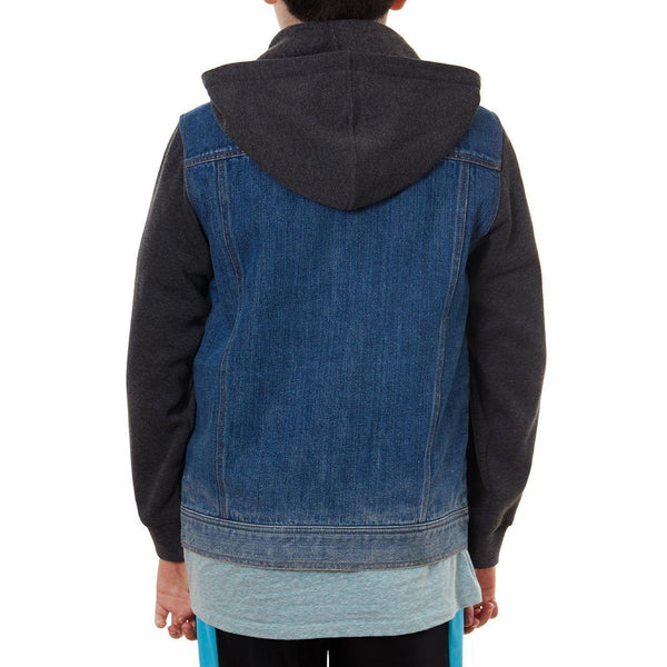 Stone washed denim jacket with fleece sleeves.